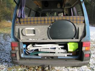 De ervaring had ons al geleerd dat je nooit teveel bergruimte hebt. De achterbank moest zo diep worden dat in de ruimte onder de bank onze tuinstoelen een plaats hadden.