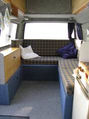 Boven de schuifdeur is een boekenplank gemaakt. Tegen het eruit vallen van de boeken en andere spullen is een opstaand randje gemaakt. De boeken worden op hun plaats gehouden door een boekensteun die zich vastklemt tussen het randje en het dak. Achter de schuifdeur is haaks op de zijkant van de auto een smal wandje opgetrokken tussen de vloer en de plaats waar de boekenplank moest komen. Tussen dit wandje en de achterbank is net langs de wielkast een onderkast gemaakt op gelijke hoogte van de zijbank, waar de bodem van het bed op kon steunen. Hierop is een iets smaller kastje gemaakt, zo hoog dat de tafel net over de bovenkant stak.