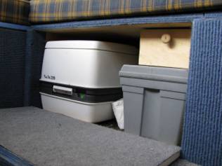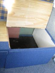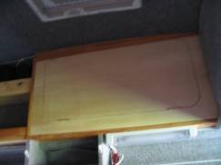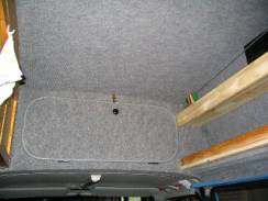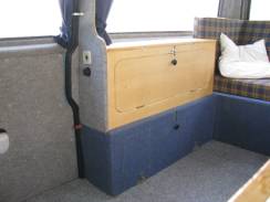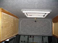 Naast het chemisch toilet is een bergvak gemaakt met een klep erop. Door het zitkussen weg te halen kan de klep worden geopend en is deze bergkast bereikbaar. Het dak boven de cabine is blijven zitten. Daarop kon gemakkelijk de bodem van de voorste dakkast worden gemaakt. Wel moest aan de open kant met een passend gezaagd latje de ruimte tussen de bovenkant van het dak en de onderkant van de kastbodem worden opgevuld. Aan de achterkant moest eerst een aluminium hoekprofiel rustend op de zijwanden voor voldoende stevigheid zorgen. Temeer omdat er geen ruimte was waar de kastbodem in één stuk door kon. Nadat beide bodems zijn geplaatst moesten eerst de bovenkastjes langs de zijkanten van het dak worden gemaakt. Met behulp van dezelfde kartonnen mallen die voor de tussenwanden van de bovenkastjes zijn gebruikt zijn aan beide kanten en aan beide kastbodems passende stukjes gezaagd en daarna vastgeschroefd, waardoor een open rechthoek ontstond met een gebogen bovenkant.