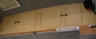 Aan de bovenkanten werd vervolgens een pas gemaakt latje onder het dak tussen de zijkanten geschroefd, waardoor voor beide kastjes een zuivere rechthoek ontstond. Van de in deze rechthoek passende platen werden de hoeken rond gezaagd. De vrijkomende stukjes werden in de hoeken van de rechthoekige gaten gezet. Voor de keukenkastjes is tussen beide kasten boven de bank eerst een plank pas gemaakt, waarna met behulp van kartonnen mallen tussenwanden zijn gemaakt. Het geheel is daarna in elkaar en op de zijkant van het uitgezaagde dak gezet. Het is aan de beide kasten vastgeschroefd en achter en boven aan het dak gekit. Voor de voorkant en de deurtjes is een stuk multiplex pas gemaakt waarna de deurtjes er uitgezaagd zijn. De voorkant is tegen de onderkant, de tussenschotjes en de dakkasten geschroefd, waarna de deurtjes er in zijn gehangen.